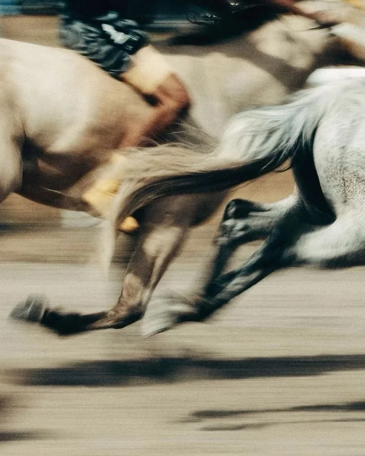 • A white horse running at full speed outdoors in a blurred black and white scene.